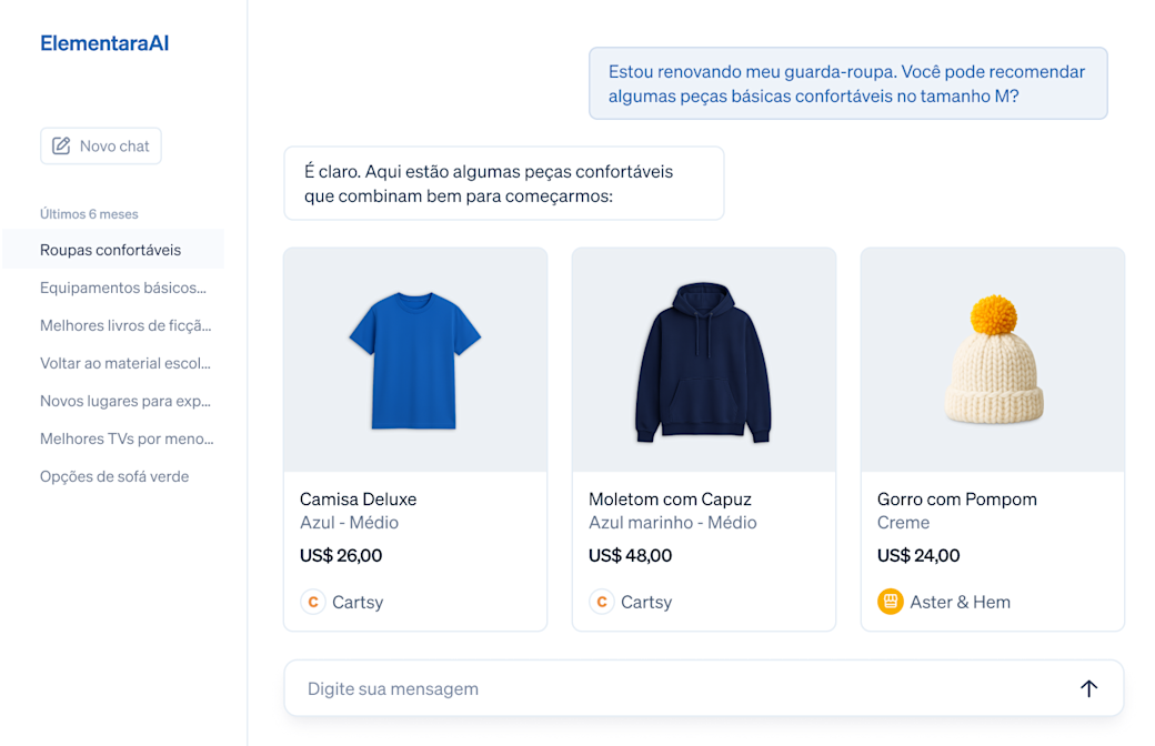 Deixe que os clientes comprem produtos físicos por meio de conversas com IA — de compras a eletrônicos e roupas.