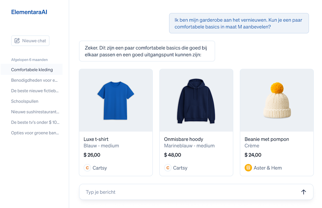 Laat klanten fysieke producten kopen via AI-gesprekken, van boodschappen tot elektronica en kleding.