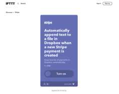 Use IFTTT to do more with Stripe by linking it to other services on the platform via Applets. Applets are new experiences you can turn on with a single switch, such as “Automatically send an email when a payment is refunded,” “Get a push notification when you get a new transfer,” or “Automatically add transactions to a Google spreadsheet.” You can browse the many Applets that are already available, or create something custom that’s unique to how you use Stripe.